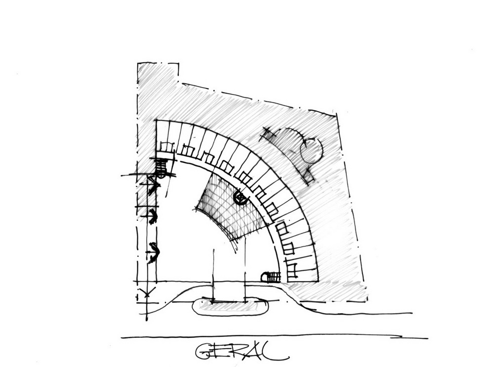 O volume construído consiste em um quarto de círculo que se desenvolve em duas alturas, tirando partido do suave declive do terreno, permitindo maior dinâmica ao plano de fachada.
