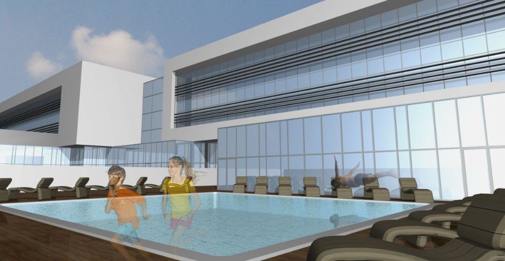 No corpo adjacente para Sul e com conexão directa ao átrio principal ficará localizado um conjunto de equipamentos de apoio aos hóspedes e outros clientes, composto por um SPA e “Fitness Center” com as diversas componentes salientando-se uma piscina coberta de exercício e com jactos de água para hidromassagem bem como um ginásio.