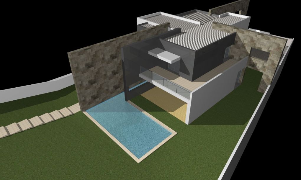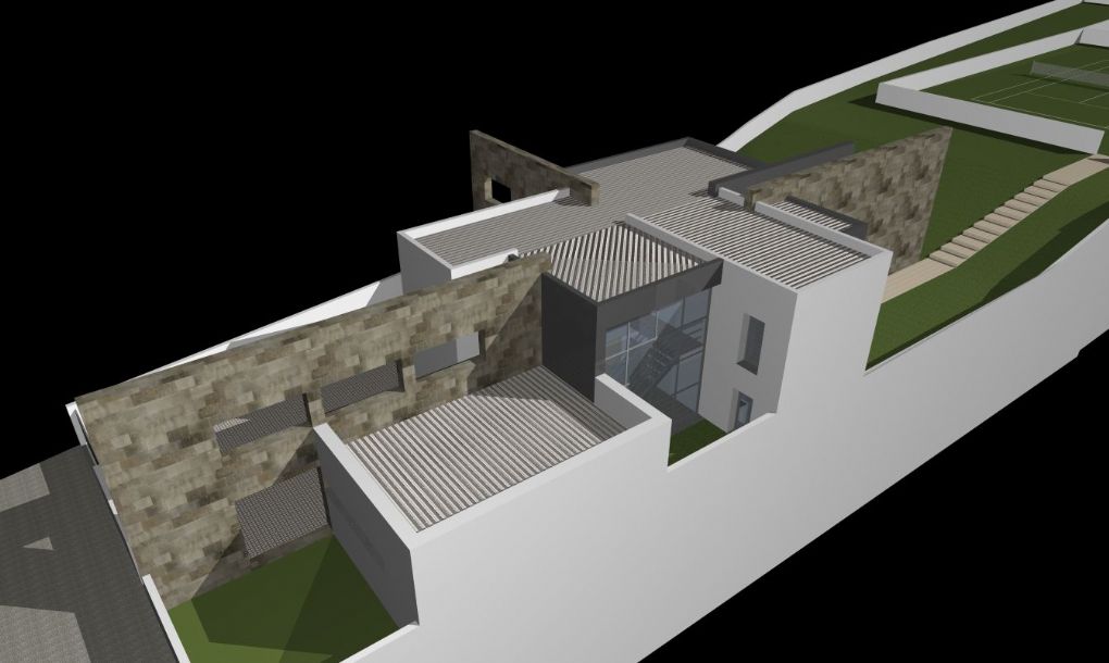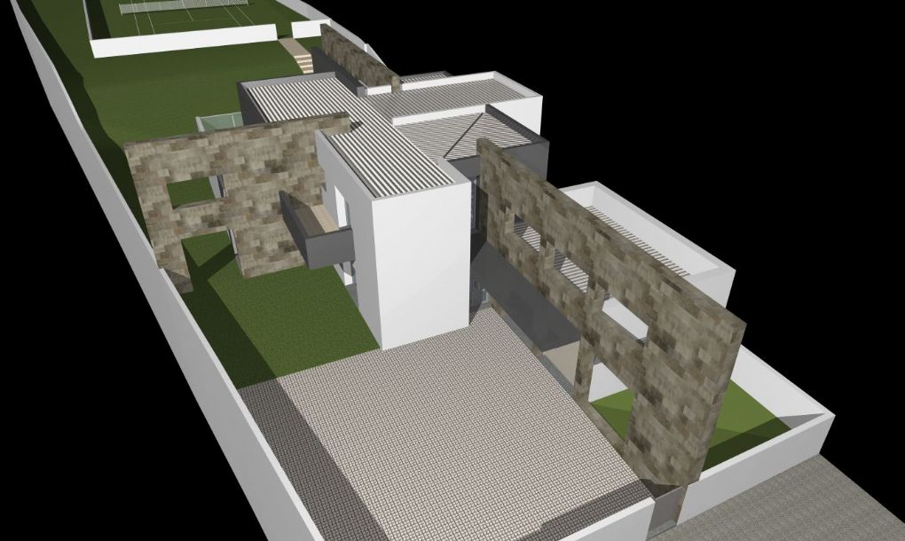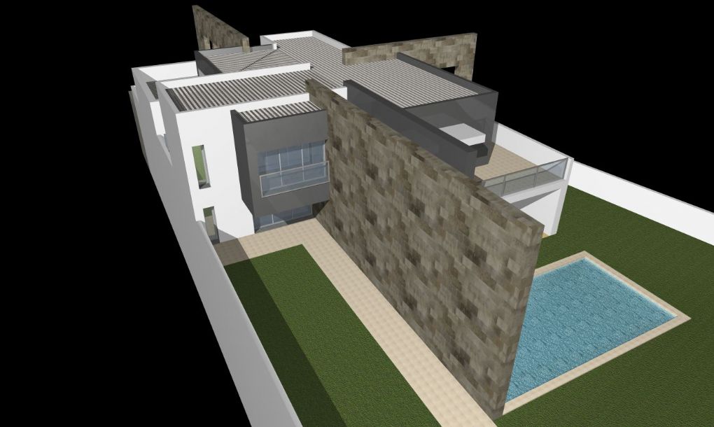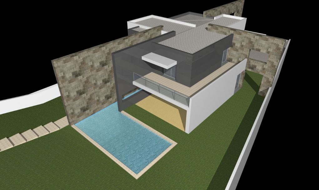 Pretende-se para o efeito uma moradia T5, equipada com garagem, lavandaria, cozinha, sala, instalação sanitária. Ainda no piso 0 existe um quarto. A partir de escada tem-se acesso ao piso 1 onde existem mais 4 quartos equipados com instalação sanitária. Na fachada Sul está prevista a construção de uma piscina.